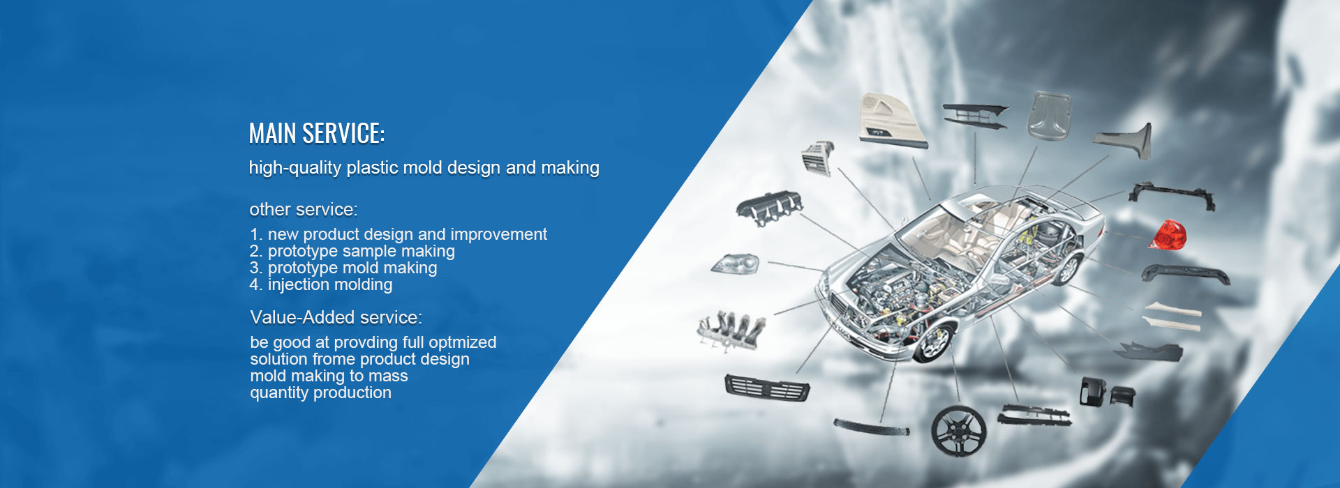 The moulds and molded products cover MEDICAL INSTRUMENTS, AUTO PARTS, MOTORCYLE PARTS, FITNESS EQUIPMENTS, ELECTRONIC DEVICES and WRITING INSTRUMENTS and so on. We aim to supply high-qaulity moulds and molded products, excellent after-sales service with reasonable offer to our clients worldwide.